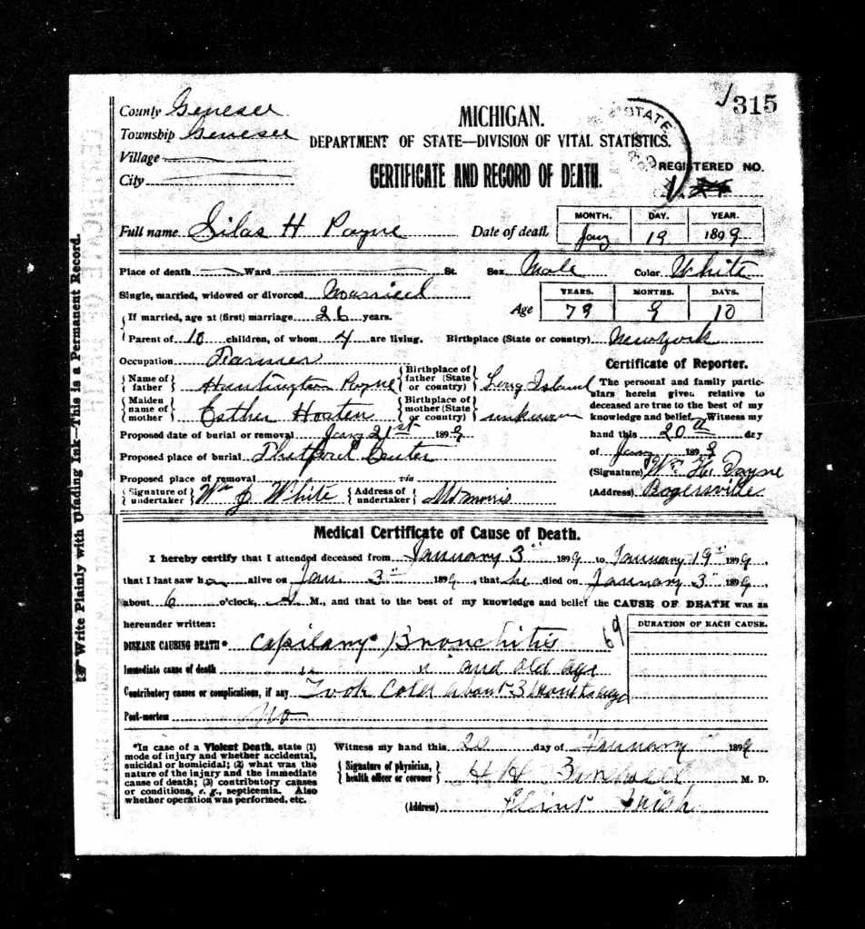 One hundred and twenty three years ago on January 18,1899, Silas Huntington died in Mt Morris, Michigan at the age of seventy-nine. According to his death certificate, he died of Bronchitis stemming from a cold which lasted for about three weeks. It appears that “Old Age” was added to to the explanation of cause of death. He was buried in Thetford Cemetery with six of his children who had died before him.
