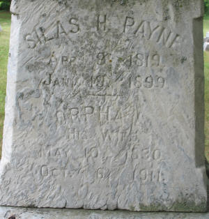 In the 1870 Federal Census, they have four children who are living at home. They are William H (Huntington), Harriet (1856), Nathan (1858) and Ester (1867). In 1874, Cleora May Payne was born but she died on January 17,1879 so she was never found in a census either. In the 1880 Federal Census, Silas and Orpha have three children who remain at home, twenty-one year old, Nathan, twelve year old, Esther and ten year old Dora who must have been born after the 1870 census was recorded.