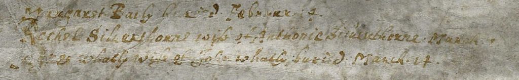 In the Ashton parish record, you find the christening records for the twins, William and Anstance on March 1, 1630 and Rachel’s burial record about 10 lines down in the Burial section is also recorded on March 1,1630. Obviously, Rachel died giving birth to these two twins, Anstance and William. Anstance died shortly after birth. Rachel was buried in ” St. Mary the Virgin Churchyard” in Steeple Ashton, Wiltshire, England and so are her children William (the first born in 1621) and Anstance (1630).
